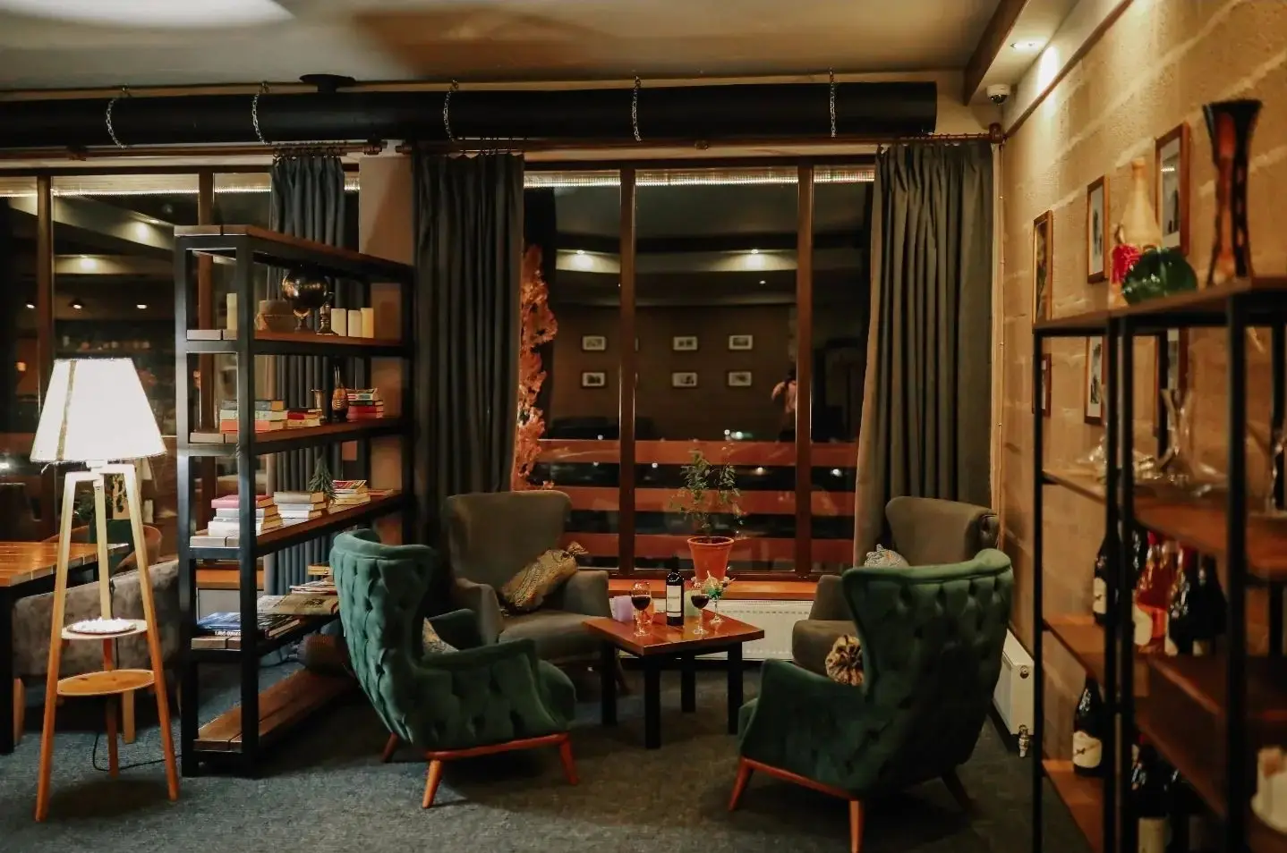 Enjoy a cocktail at our stylish bar, or savor a fine dining experience with famous Georgian wines with a backdrop of stunning Mountain views.
